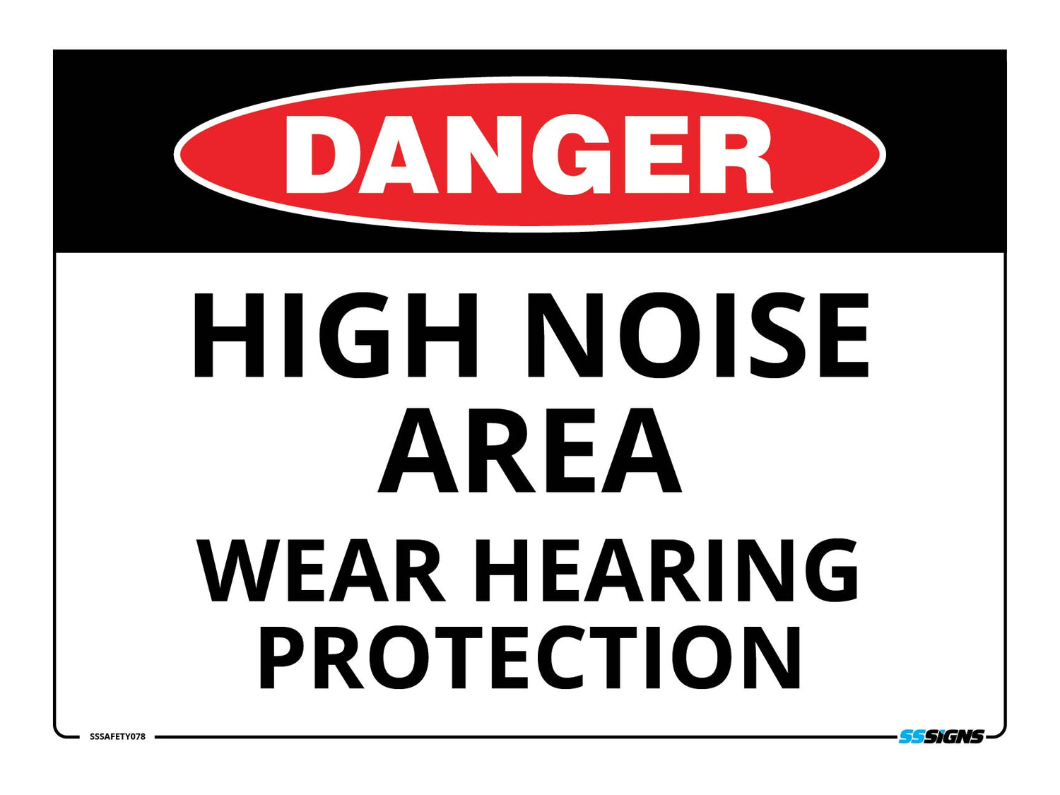 Danger - High Noise Area - SSSafety078 - 5mm Corflute (600mm x 450mm) / Eyelets in Each Corner / 5 Year Gloss Laminate is backordered and will ship as soon as it is back in stock.